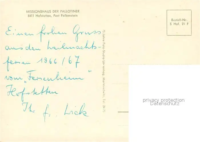 Falkenstein_Oberpfalz Missionshaus der Pallotiner Hofstetten Falkenstein_Oberpfalz postalisch nicht gelaufen 1967 Erhaltung siehe scans [WerneD78] WernPID7