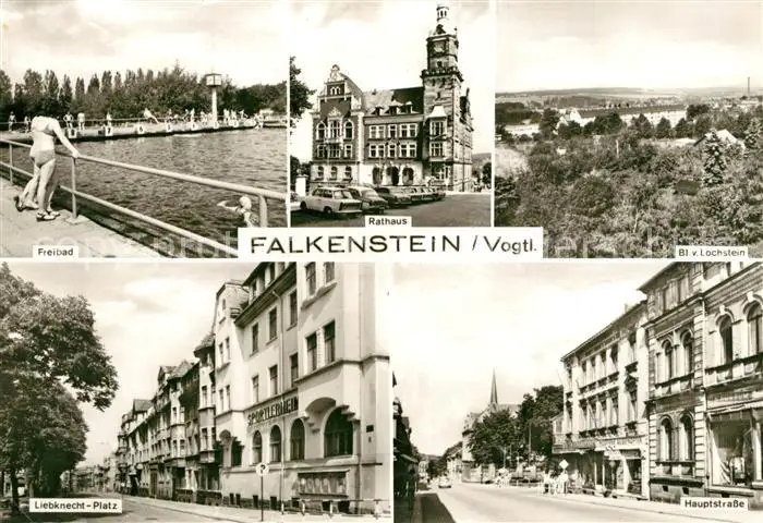 AK / Ansichtskarte Falkenstein_Vogtland Freibad Rathaus Liebknecht Platz Hauptstrasse Falkenstein_Vogtland