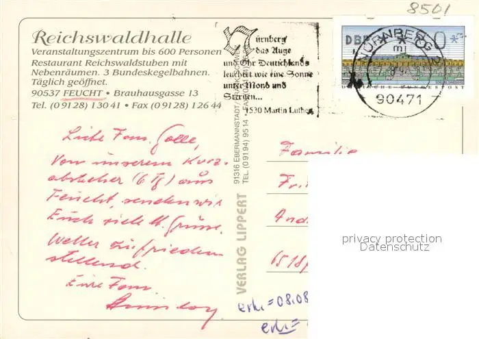 Feucht Reichswaldhalle Veranstaltungszentrum Restaurant Kegelbahnen Feucht postalisch gelaufen 1996 Erhaltung siehe scans [FriedD77] Frierer