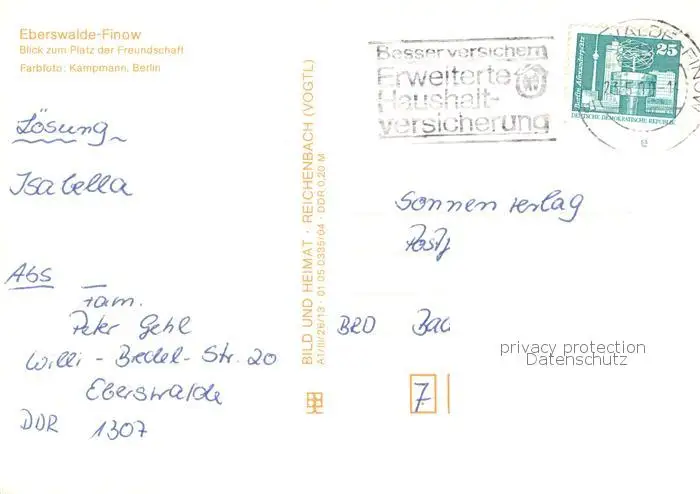 Finow_Eberswalde Platz der Freundschaft Finow Eberswalde postalisch gelaufen 1988 Erhaltung siehe scans [FriedD77] Frierer