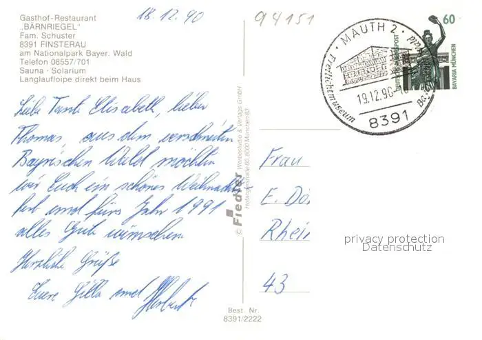 Finsterau_Bayerischer_Wald Gasthof Restaurant Baernriegel im Winter Finsterau_Bayerischer postalisch gelaufen 1990 Erhaltung siehe scans [FriedD77] Frierer