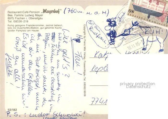 Fischen_Allgaeu Restaurant Pension Mayerhof Fischen Allgaeu postalisch gelaufen 1986 Erhaltung siehe scans [WerneD78] WernPID7
