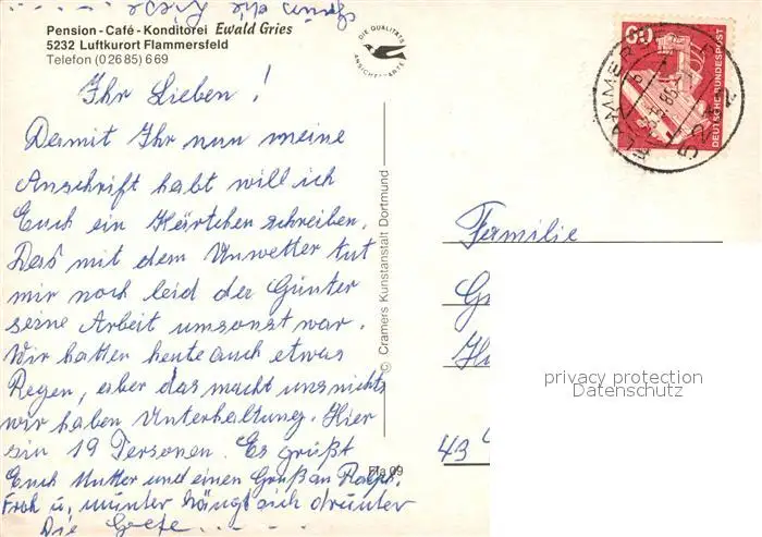 Flammersfeld Pension Cafe Konditorei Ewald Gries Garten Liegewiese Flammersfeld postalisch gelaufen 1985 Erhaltung siehe scans [FriedD77] Frierer