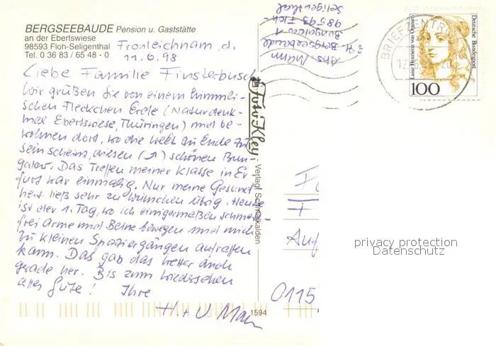 Floh-Seligenthal Bergseebaude Pension Gaststaette am Rennsteig Ebertswiese Badesee Floh-Seligenthal postalisch gelaufen 1998 Erhaltung siehe scans [FriedD77] Frierer
