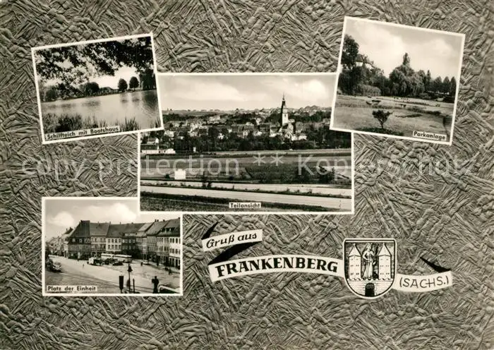AK / Ansichtskarte Frankenberg_Sachsen Schilfteich mit Bootshaus Parkanlage Platz der Einheit Stadtpanorama Wappen Frankenberg Sachsen