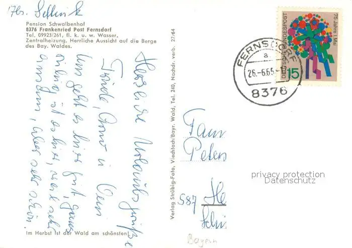 Frankenried_Geiersthal Kategorie Alte Ansichtskarten Postkarten bx93215 Frankenried_Geiersthal Pension Schwalbenhof Restaurant Zimmer Frankenried_Geiersthal postalisch gelaufen 1965 Erhaltung siehe scans [WerneD78]