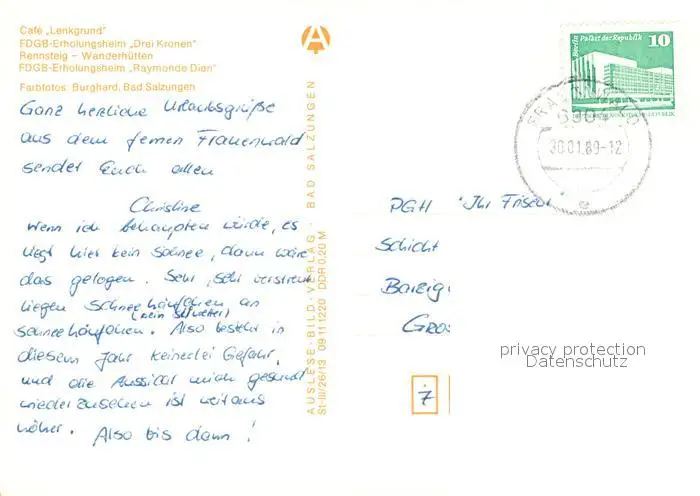 Frauenwald_Thueringen Cafe Lenkgrund FDGB Erholungsheime Drei Kronen und Raymonde Dien Rennsteig Wanderhuetten Frauenwald Thueringen postalisch gelaufen 1989 Erhaltung siehe scans [WerneD78] WernPID7