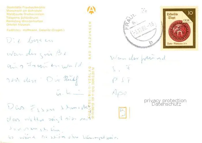 Frauenwald_Thueringen Wanderziele der Umgebung Gaststaette Fraubachmuehle Monument Waldbaude Talsperre Schoenbrunn Rennsteig Wanderhuetten Frauenwald Thueringen postalisch gelaufen 1986 Erhaltung siehe scans [FriedD77] Frierer