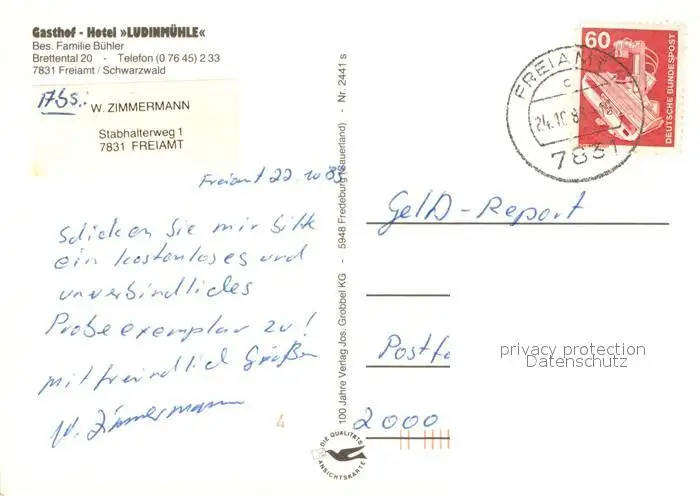 Freiamt Gasthof Hotel Ludinmuehle Gastraum Freiamt postalisch nicht gelaufen nach 1965 Erhaltung siehe scans [FriedD77] Frierer