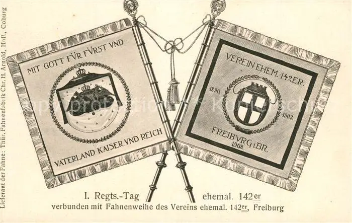 Freiburg Breisgau Kategorie Alte Ansichtskarten Postkarten bx56257 Freiburg_Breisgau I. Regts. Tag ehemal. 142 verbunden mit Fahnenweihe des Vereins ehemal. 142 Freiburg Breisgau postalisch nicht gelaufen Erhaltung siehe scans [NatalD47]