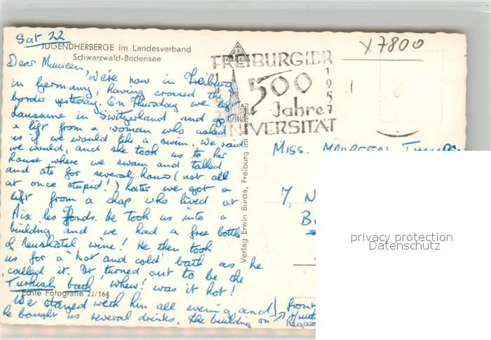 Freiburg_Breisgau Jugendherberge Schwarzwald Bodensee Freiburg Breisgau postalisch gelaufen nach 1965 Erhaltung siehe scans [WerneD78] WernPID7