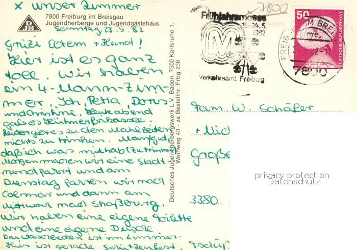 Freiburg_Breisgau Jugendherberge und Jugendgaestehaus Freiburg Breisgau postalisch gelaufen 1982 Erhaltung siehe scans [WerneD78] WernPID7