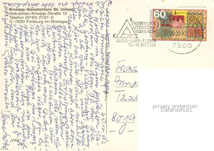 Freiburg_Breisgau Kneipp Sanatorium St. Urban Freiburg Breisgau postalisch gelaufen 1992 Erhaltung siehe scans [FriedD77] Frierer