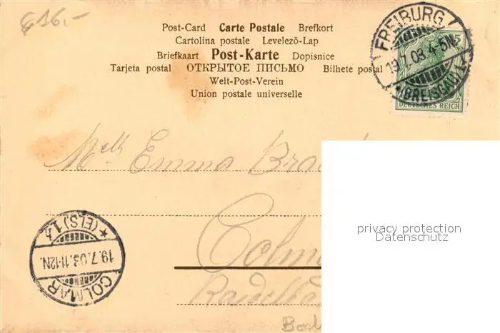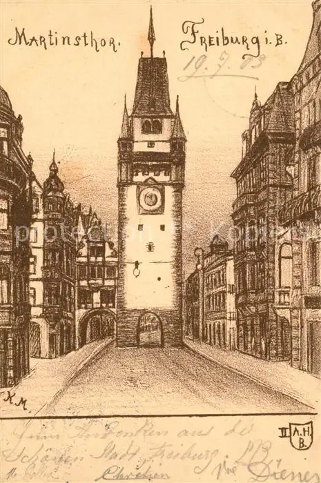 Freiburg_Breisgau Martinstor Zeichnung Kuenstlerkarte Freiburg Breisgau postalisch gelaufen 1903 Erhaltung siehe scans [FriedD77] Frierer