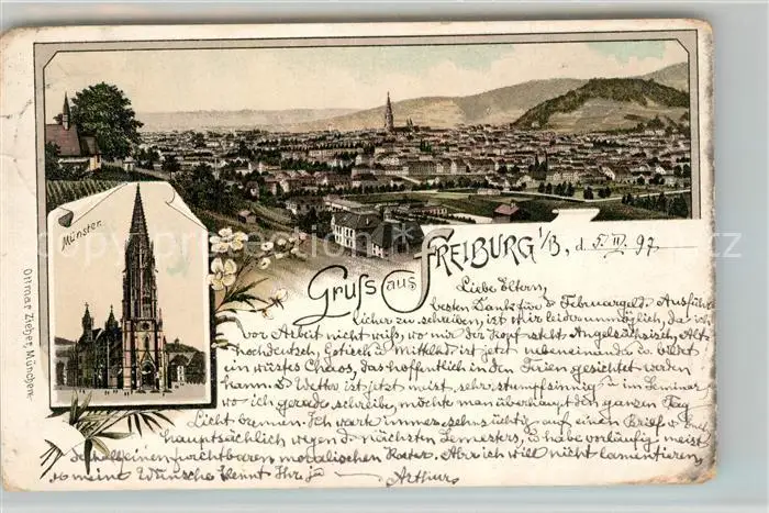 Freiburg_Breisgau Panorama Muenster Freiburg Breisgau postalisch gelaufen 1897 Erhaltung siehe scans [WerneD78] WernPID7