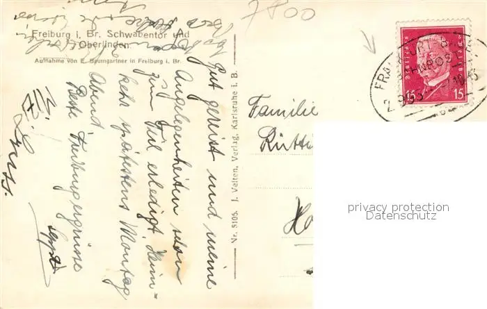 Freiburg_Breisgau Schwabentor Oberlinden Freiburg Breisgau postalisch gelaufen 1933 Bahnpost Erhaltung siehe scans [KathaD81] Bahnpost Kathoren