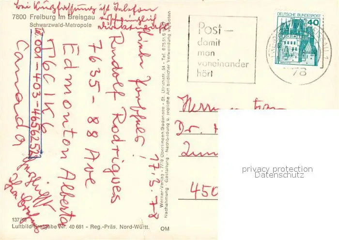 Freiburg_Breisgau Schwarzwald Metropole mit Blick zum Feldberg Schwarzwald Fliegeraufnahme Freiburg Breisgau postalisch gelaufen 1978 Erhaltung siehe scans [FriedD77] Frierer