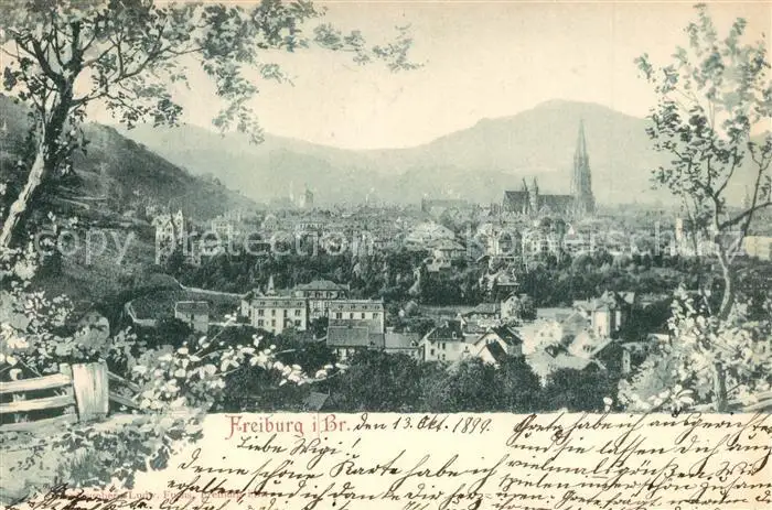 Freiburg_Breisgau Stadtpanorama mit Muenster Freiburg Breisgau postalisch gelaufen 1899 Erhaltung siehe scans [FriedD77] Frierer