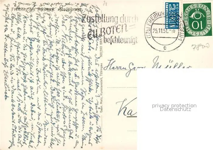 Freiburg_Breisgau Stadttheater Freiburg Breisgau postalisch gelaufen 1951 Erhaltung siehe scans [KathaD81] Kathoren