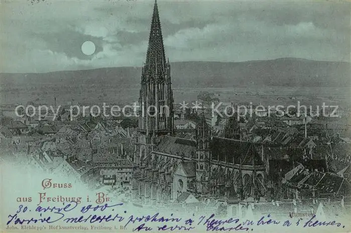 Freiburg_Breisgau Vogelperspektive M?nster bei Vollmond Freiburg Breisgau postalisch gelaufen 1900 Erhaltung siehe scans [LiesaD40] LiesID40