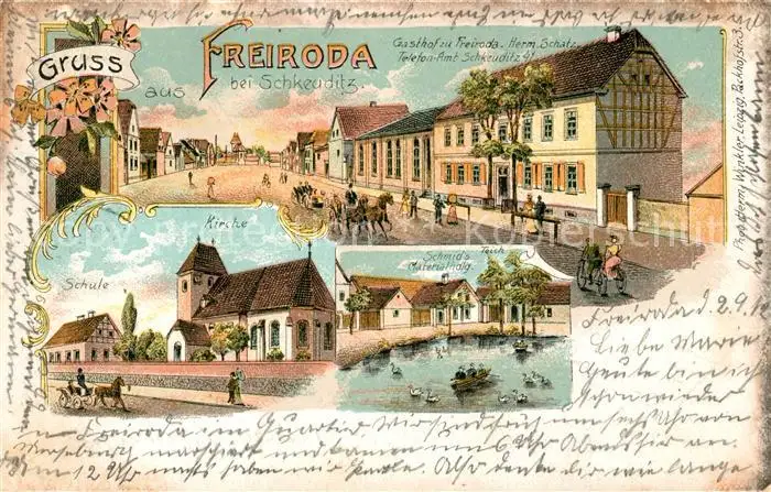 Freiroda_Schkeuditz Kategorie Alte Ansichtskarten Postkarten bx76618 Freiroda_Schkeuditz Gasthof Kirche Teich Litho postalisch gelaufen Erhaltung siehe scans [FriedD77]