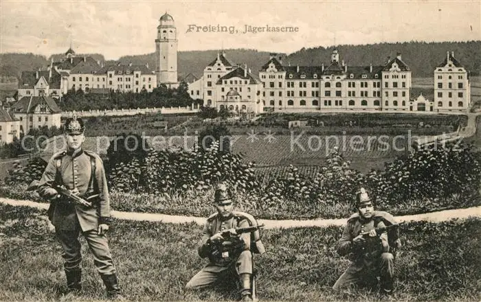 Freising Oberbayern Kategorie Alte Ansichtskarten Postkarten bx89262 Freising_Oberbayern Jaegerkaserne Soldaten Freising Oberbayern postalisch gelaufen Erhaltung siehe scans [FriedD77]
