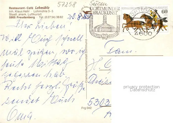 Freudenberg_Oberpfalz Restaurant Café Lohmuehle Kegelbahn Freudenberg Oberpfalz postalisch gelaufen 1985 Erhaltung siehe scans [LiesaD40] LiesID40