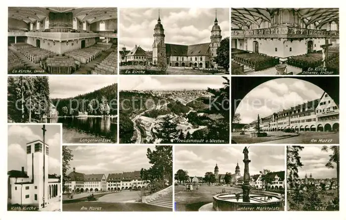 Freudenstadt Ev Kirche Inneres Langenwaldsee Panorama Am Markt Kath Kirche Unterer Marktplatz mit Brunnen Total Freudenstadt postalisch nicht gelaufen 1921-1965 Erhaltung siehe scans [WerneD78] WernPID7