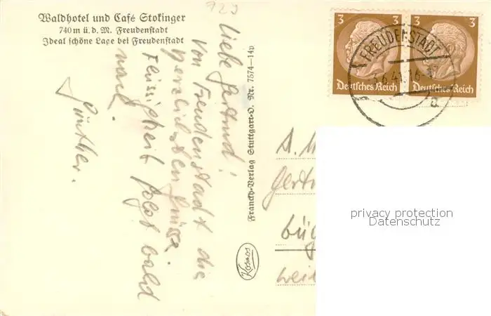 Freudenstadt Waldhotel Cafe Stokinger Freudenstadt postalisch gelaufen 1941 Erhaltung siehe scans [FriedD77] Frierer