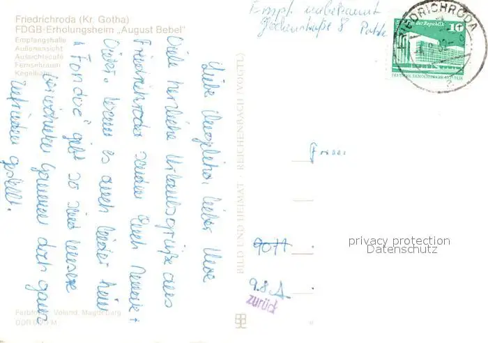 Friedrichroda FDGB Erholungsheim August Bebel Empfangshalle Café Fernsehraum Kegelbahn Friedrichroda postalisch gelaufen 1982 Erhaltung siehe scans [FriedD77] Frierer