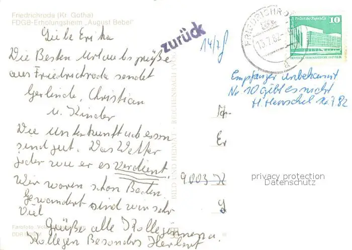 Friedrichroda FDGB Erholungsheim August Bebel Friedrichroda postalisch gelaufen 1982 Erhaltung siehe scans [FriedD77] Frierer