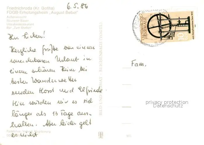 Friedrichroda FDGB Erholungsheim August Bebel Souvenir Basar Restaurant Bar Friedrichroda postalisch gelaufen 1986 Erhaltung siehe scans [FriedD77] Frierer