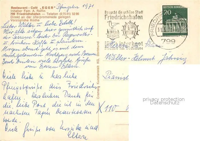 Friedrichshafen_Bodensee Restaurant Cafe Eger Gastraeume Friedrichshafen Bodensee postalisch gelaufen 1971 Erhaltung siehe scans [WerneD78] WernPID7
