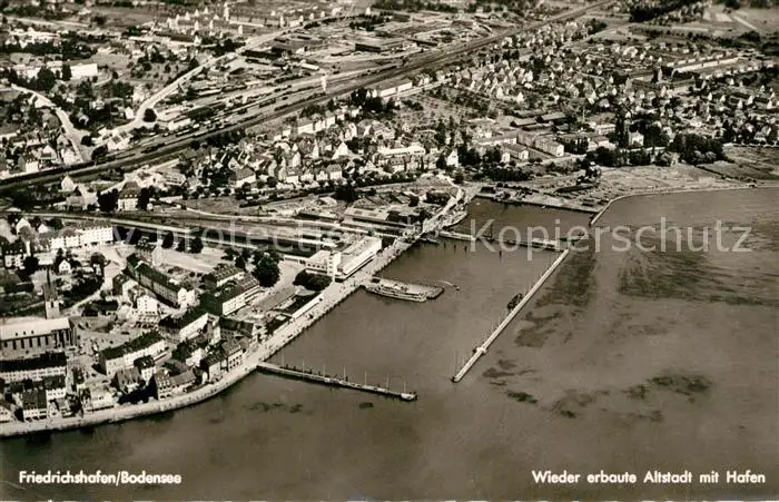 Friedrichshafen_Bodensee Wieder erbaute Altstadt mit Hafen Fliegeraufnahme Friedrichshafen Bodensee postalisch gelaufen 1954 Erhaltung siehe scans [FriedD77] Frierer