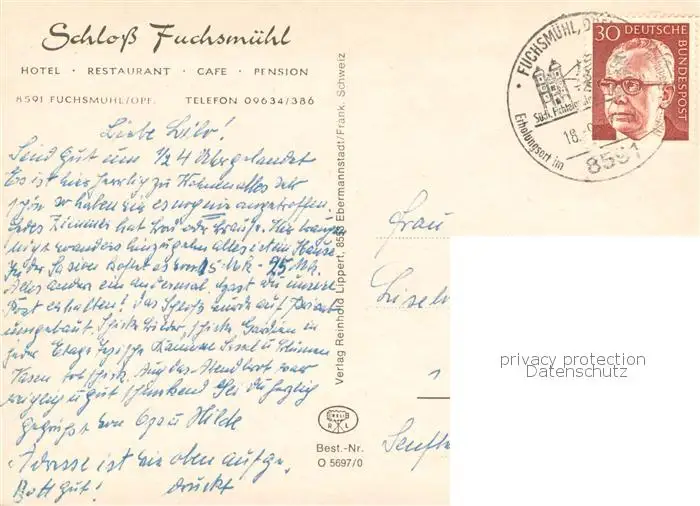 Fuchsmuehl Schloss Fuchsmuehl Hotel Restaurant Gastraeume Zimmer Fuchsmuehl postalisch gelaufen 1973 Erhaltung siehe scans [WerneD78] WernPID7