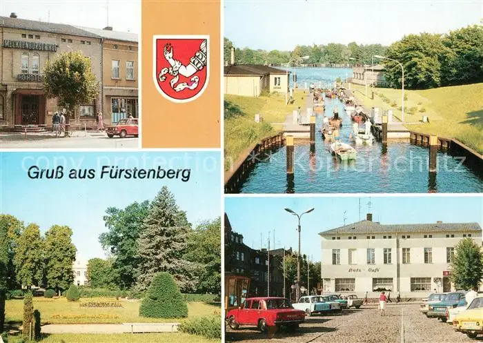 AK / Ansichtskarte Fuerstenberg_Havel HO Hotel Mecklenburger Hof Schleuse parkanlage Markt mit Rats Cafe Fuerstenberg_Havel