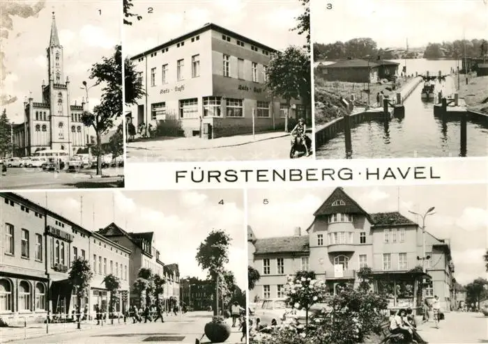 AK / Ansichtskarte Fuerstenberg_Havel Kirche HO Gaststaette Ratscafe Schleuse HO Hotel Mecklenburger Hof Ernst Thaelmann Strasse Rathaus Fuerstenberg_Havel