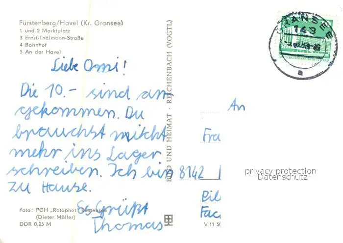Fuerstenberg_Havel Marktplatz Ernst Thaelmann Strasse Bahnhof An der Havel Fuerstenberg_Havel postalisch gelaufen 1983 Erhaltung siehe scans [WerneD78] WernPID7