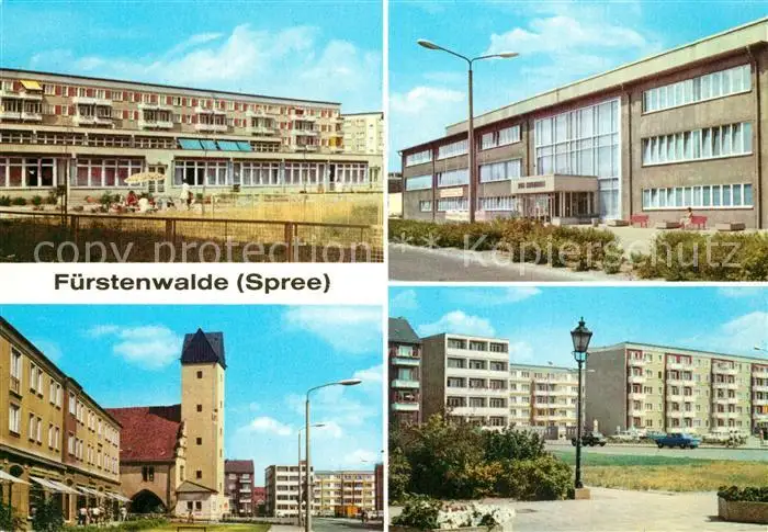 AK / Ansichtskarte Fuerstenwalde_Spree Kinderkrippe Kindergarten Spree Schwimmhalle Muehlenstrasse Strasse der Jugend Siedlung Plattenbauten Fuerstenwalde_Spree