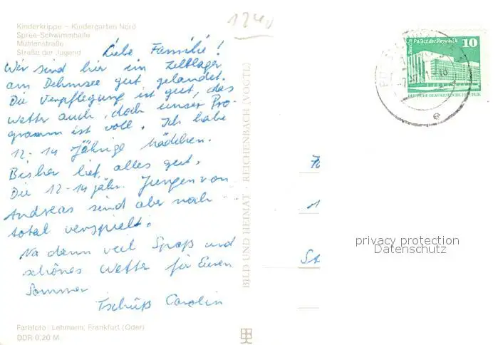 Fuerstenwalde_Spree Kinderkrippe Kindergarten Spree Schwimmhalle Muehlenstrasse Strasse der Jugend Siedlung Plattenbauten Fuerstenwalde_Spree postalisch gelaufen 1980 Erhaltung siehe scans [FriedD77] Frierer