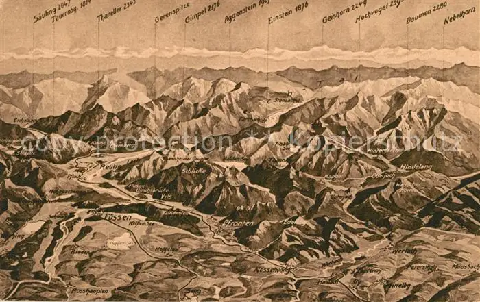 Fuessen_Allgaeu Panoramakarte mit Pfronten und Hindelang Fuessen Allgaeu postalisch nicht gelaufen 1921-1965 Erhaltung siehe scans [WerneD78] WernPID7