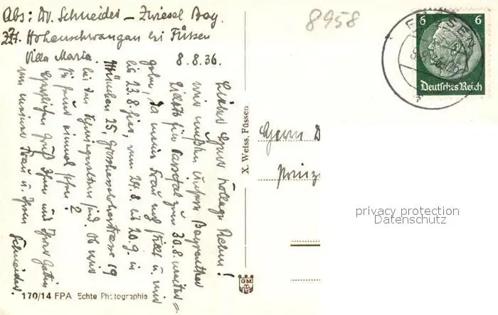 Fuessen_Allgaeu mit Kirche Schloss und Saeuling Fuessen Allgaeu postalisch gelaufen 1936 Erhaltung siehe scans [WerneD78] WernPID7
