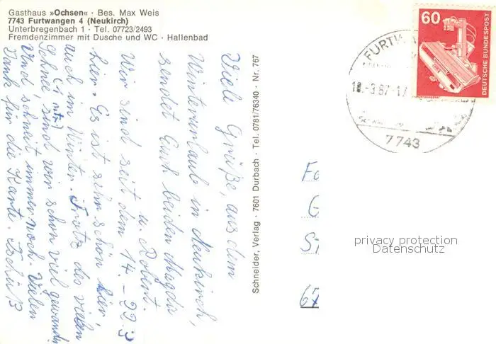 Furtwangen Gasthaus Ochsen Furtwangen postalisch gelaufen 1987 Erhaltung siehe scans [WerneD78] WernPID7