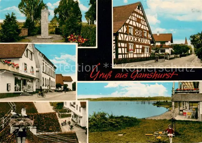 AK / Ansichtskarte Gamshurst Denkmal Ladenschaeft Fachwerkhaus Strassenpartie Storchennest Haus am See Gamshurst