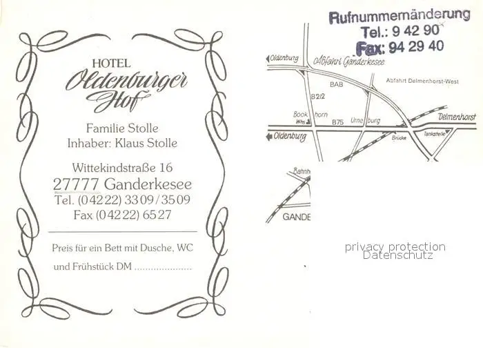 Ganderkesee Hotel Oldenburger Hof Restaurant Kegelbahn Ganderkesee postalisch nicht gelaufen nach 1965 Werbekarte (keine Postkarte) Erhaltung siehe scans [FriedD77] Werbekarte (keine Postkarte) Frierer