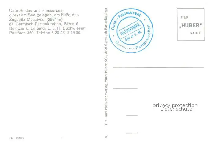 Garmisch-Partenkirchen Café Restaurant Riessersee am Fusse des Zugspitzmassives Huber Karte Nr. 10106 Garmisch-Partenkirchen postalisch nicht gelaufen nach 1965 Erhaltung siehe scans [FriedD77] Frierer