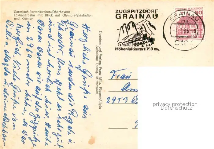 Garmisch-Partenkirchen Eckbauerbahn mit Blick auf Olympia Skistadion und Kramer Ammergauer Alpen Garmisch-Partenkirchen postalisch gelaufen 1985 Erhaltung siehe scans [FriedD77] Frierer