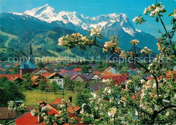 AK / Ansichtskarte Garmisch Partenkirchen Ortsansicht mit Kirche gegen Zugspitzgruppe Wettersteingebirge Baumbluete Garmisch Partenkirchen