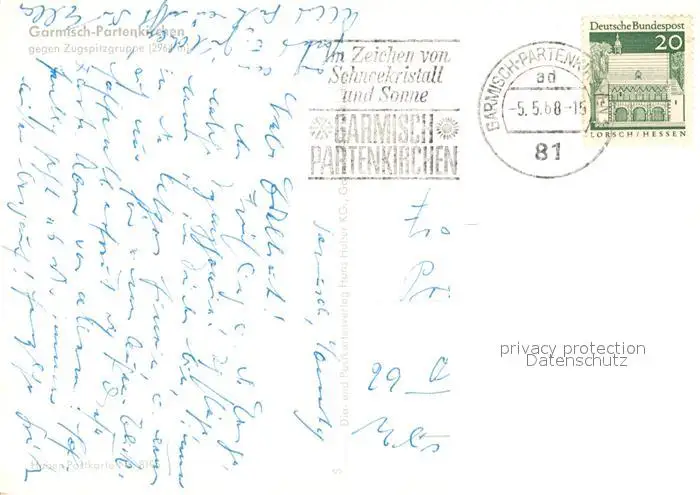 Garmisch-Partenkirchen Ortsansicht mit Kirche gegen Zugspitzgruppe Wettersteingebirge Baumbluete Garmisch-Partenkirchen postalisch gelaufen 1968 Erhaltung siehe scans [FriedD77] Frierer