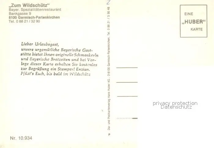 Garmisch-Partenkirchen Restaurant Zum Wildschuetz Gesamtansicht mit Alpenpanorama Huber Karte Nr 10934 Garmisch-Partenkirchen postalisch nicht gelaufen nach 1965 Erhaltung siehe scans [FriedD77] Frierer